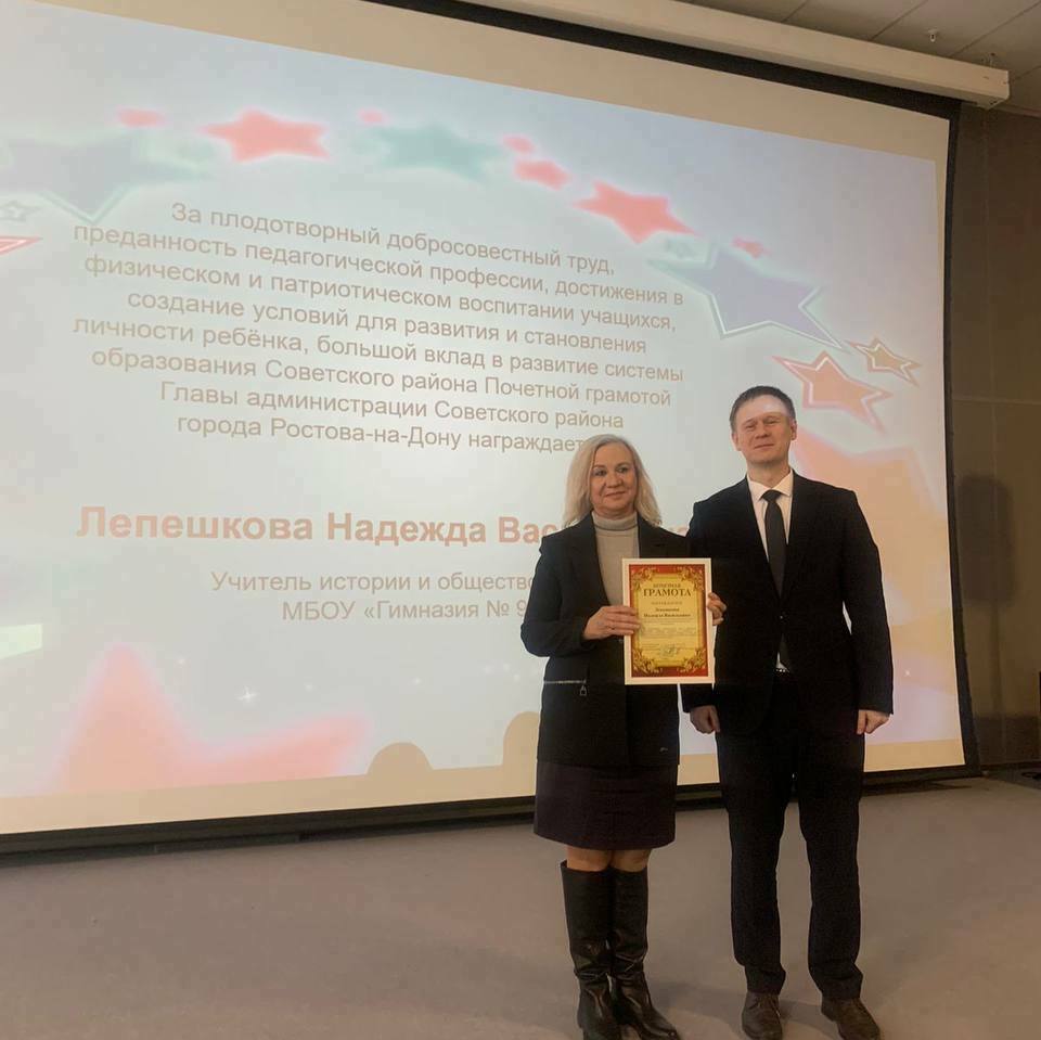 29 февраля в историческом парке Россия – моя история, прошло мероприятие, посвященное закрытию месячника оборонно-массовой работы. В рамках акции ученики гимназии приняли участие в проекте, посвященном 80-летию Корсунь-шевченковской наступательной операции. По итогам акции ученики гимназии были отмечены грамотами. Олцетян София награждена грамотой за 1 место в районном отборочном этапе городского конкурса «С чего начинается Родина» в номинации ««С чего начинается Родина?» в рисунках» (возрастная группа 5-7 классы. Гришанова Варвара награждена грамотой за 1 место в районном отборочном этапе городского конкурса «С чего начинается Родина» в номинации ««С чего начинается Родина?» в сочинениях» (возрастная группа 8-11 класс). Почетной грамотой награждена руководитель школьного музея, учитель истории и обществознания Лепешкова Надежда Васильевна за плодотворный добросовестный труд, преданность педагогической профессии, достижения в физическом и патриотическом воспитании учащихся, создания условий для развития и становления личности ребенка, большой вклад в развитие системы образования Советского района.