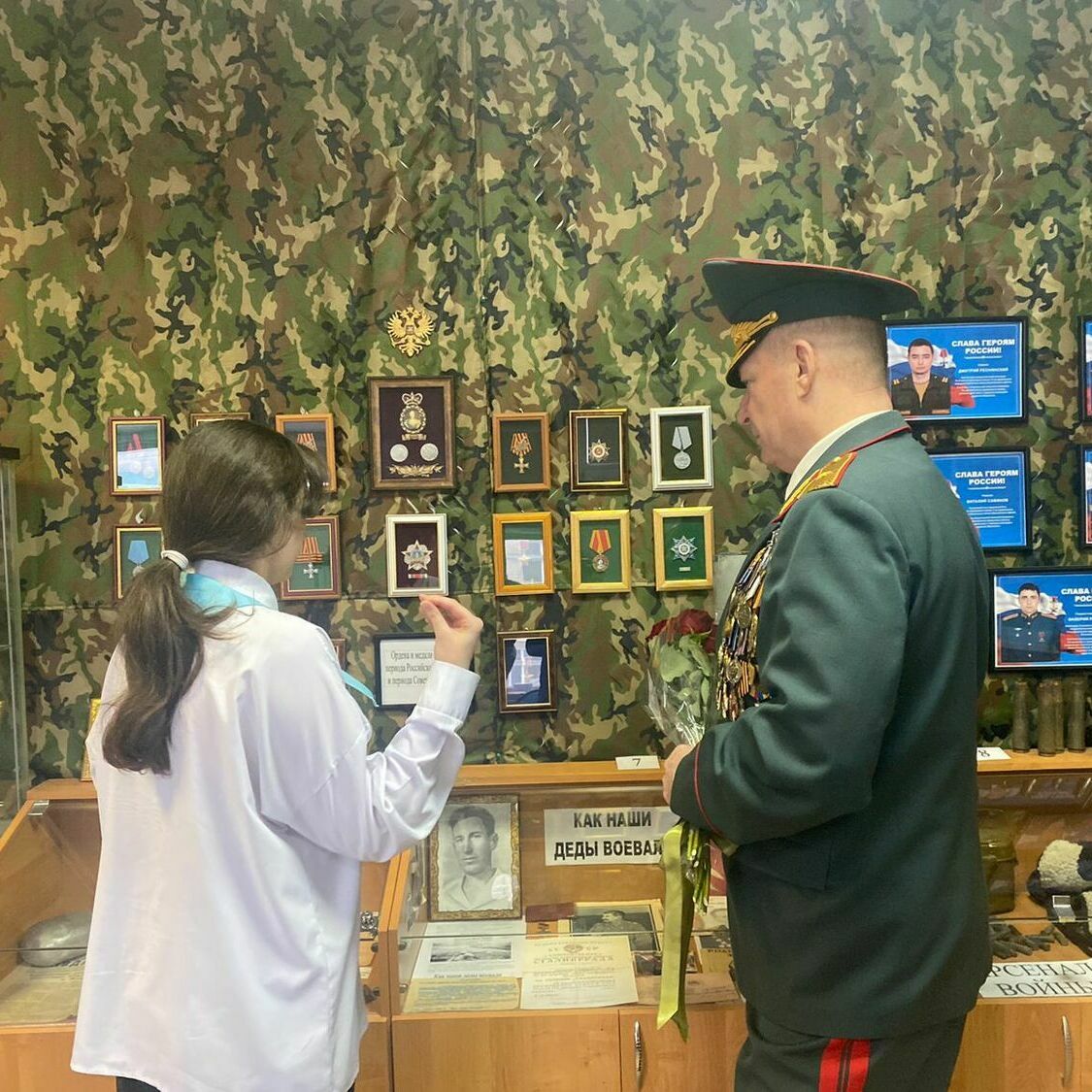 После мероприятия Александр Иванович Дзюба посетил школьный музей «Ратная Слава России». Экскурсоводы музея Герегиев Георгий и Ефремова Мария познакомили гостя с историей создания школьного музея, показали выставку, под названием «Герои нашего времени», а также экспозицию, посвященную Героям специальной военной операции.
