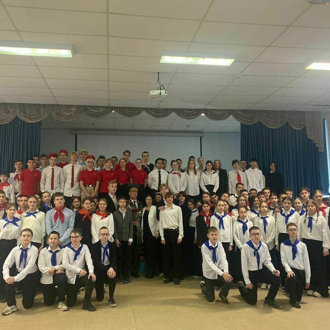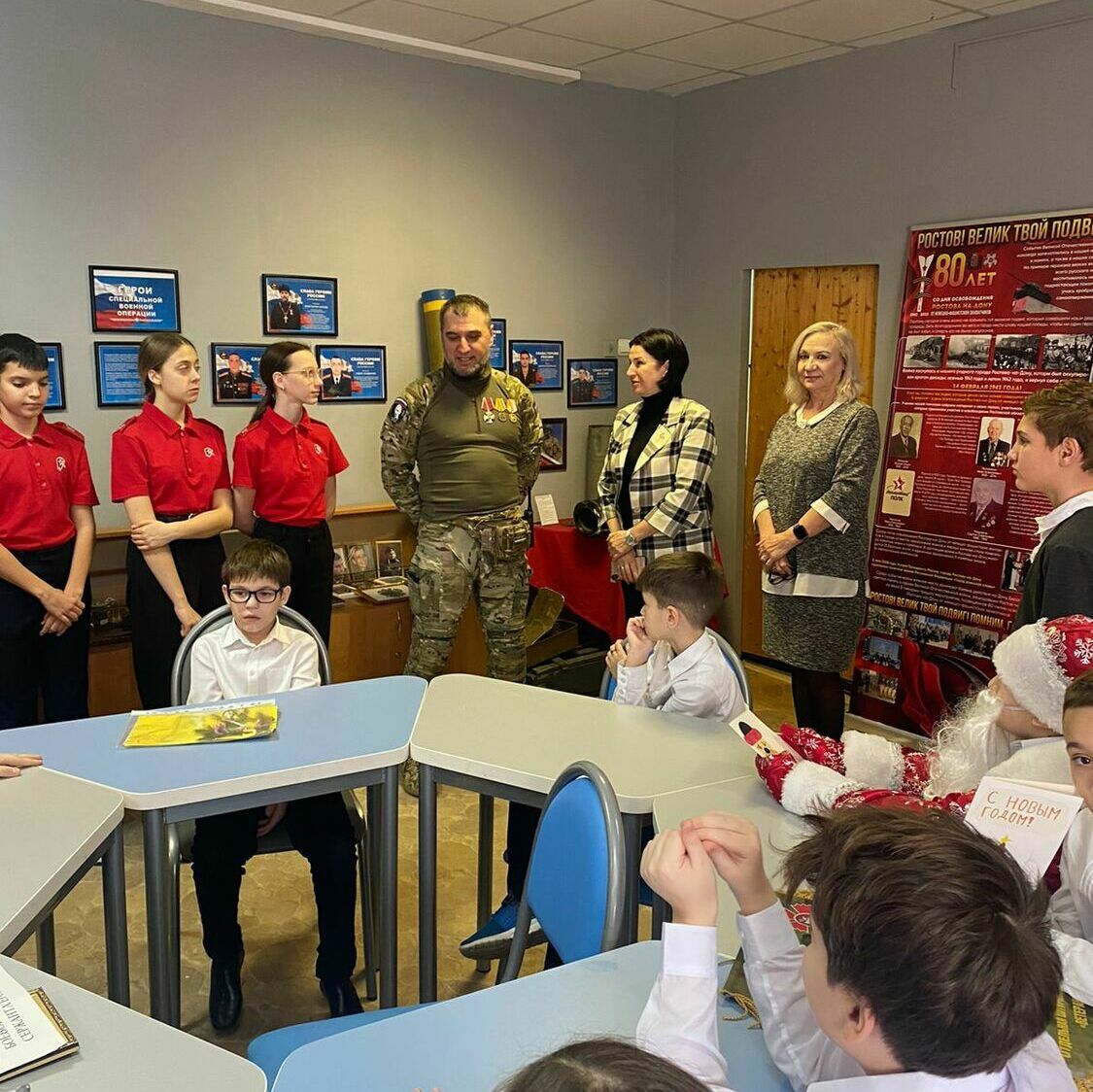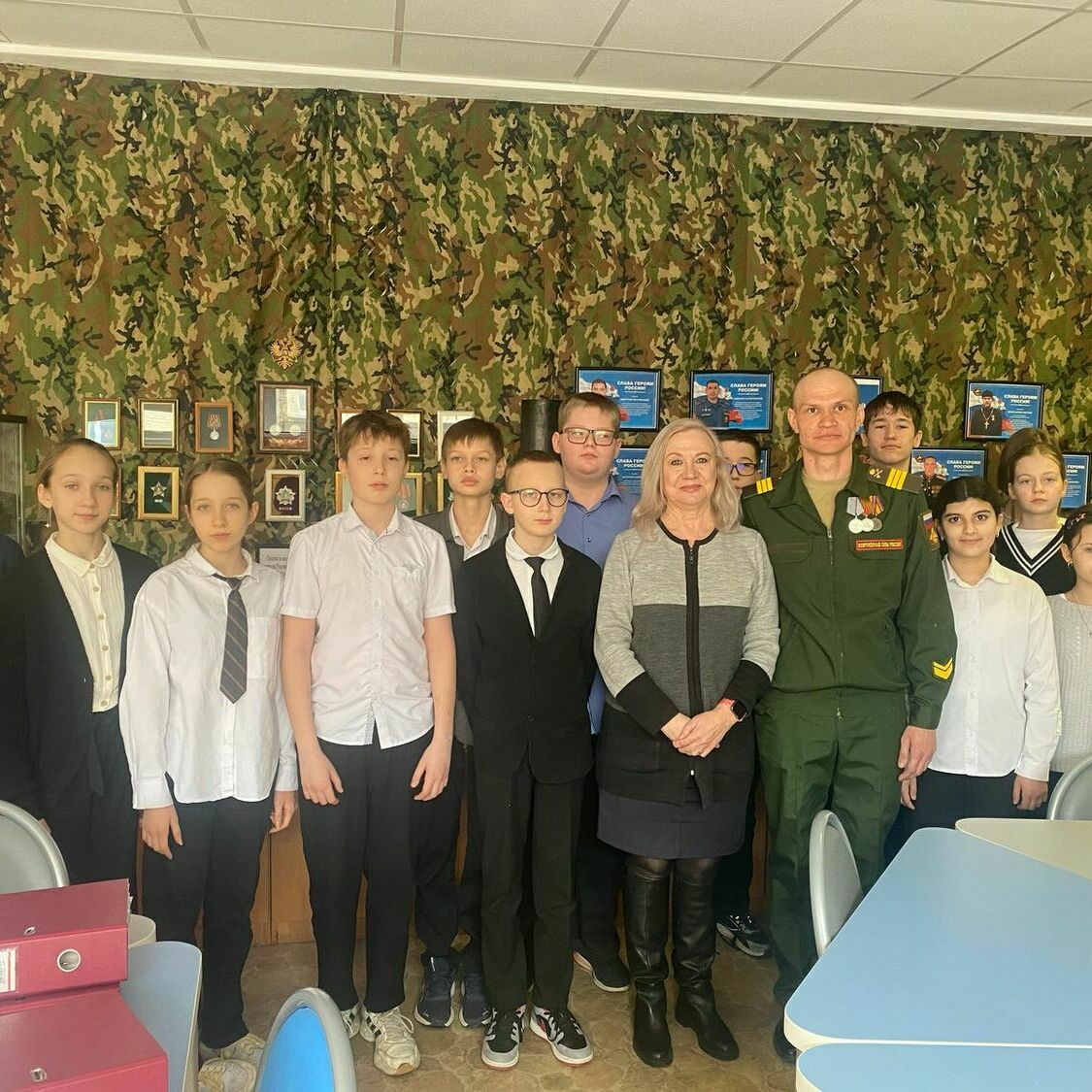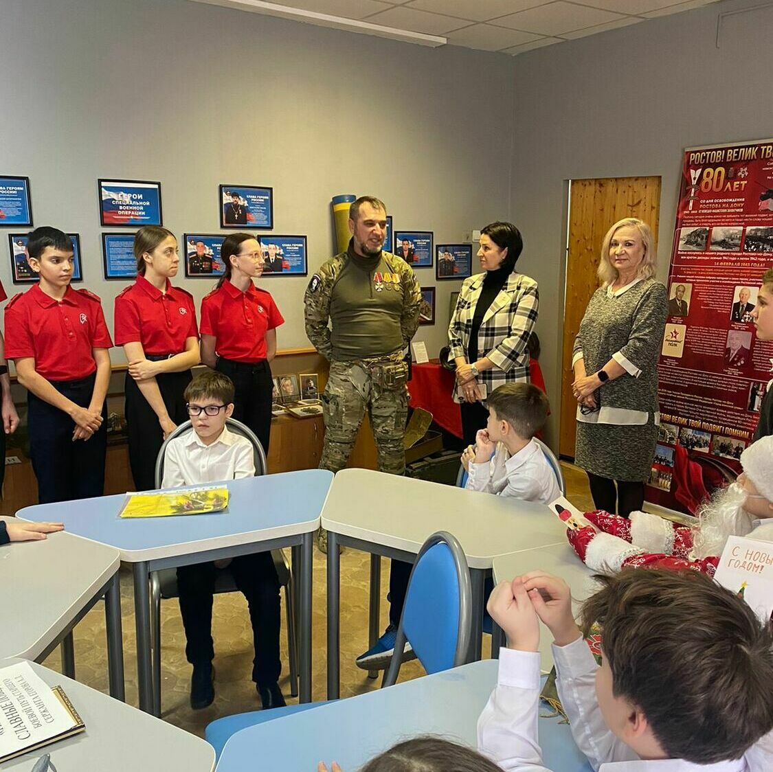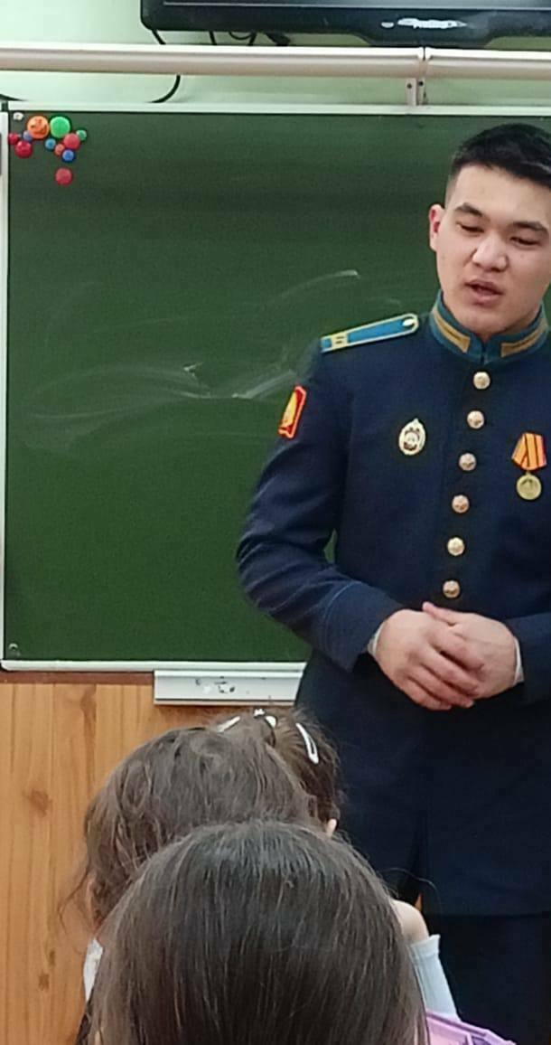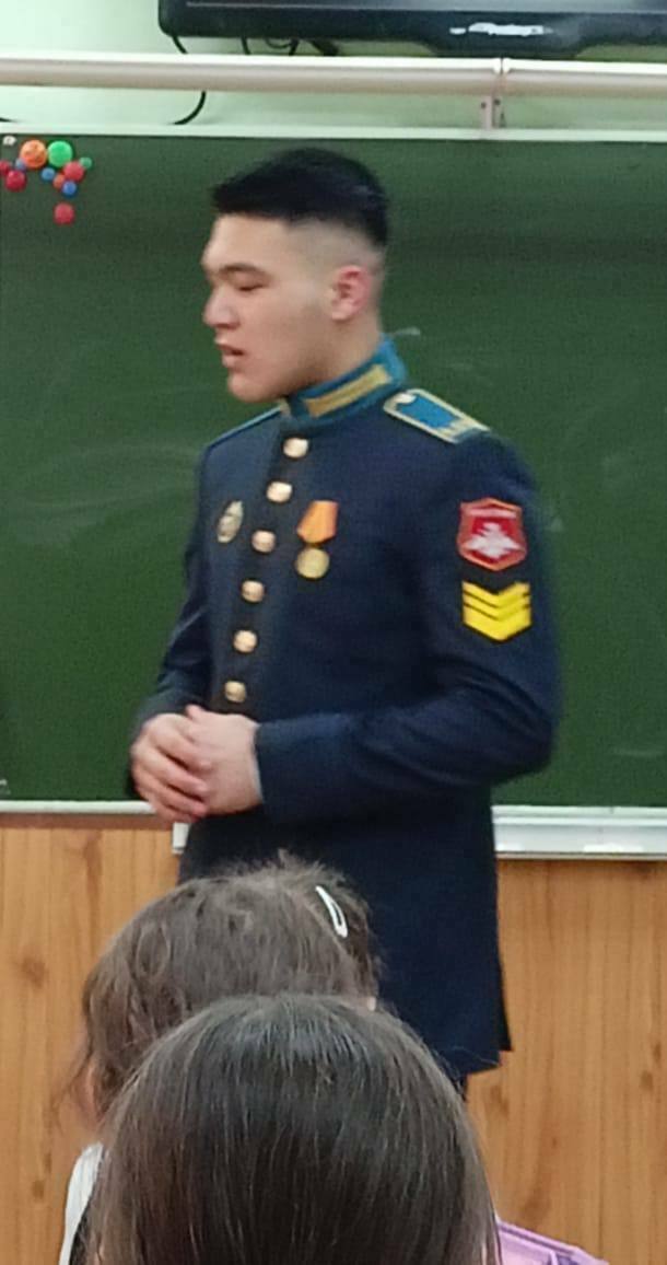 В МБОУ «Гимназия №95» прошло мероприятие, посвященное Году защитника Отечества и 80-летия Великой Победы, в котором приняли участие почетные гости - руководитель партии «Единая Россия» Советского района Левин Леонид Сергеевич, подполковник в отставке Горохов Владимир Михайлович и старший лейтенант, действующий участник СВО.