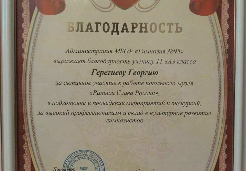 25 мая, на линейке, посвящённой празднику Последнего звонка, председатель актива музея «Ратная Слава России» Герегиев Георгий был награждён за активное участие в работе школьного музея, в подготовке и проведении мероприятий и экскурсий, за высокий профессионализм и вклад в культурное развитие гимназистов почётной статуэткой Лучшему экскурсоводу музея «Ратная Слава России» и благодарственным письмом от администрации МБОУ «Гимназия N°95» в лице директора гимназии Филипповой Ольги Викторовны и руководителя школьного музея Лепешковой Надежды Васильевны!